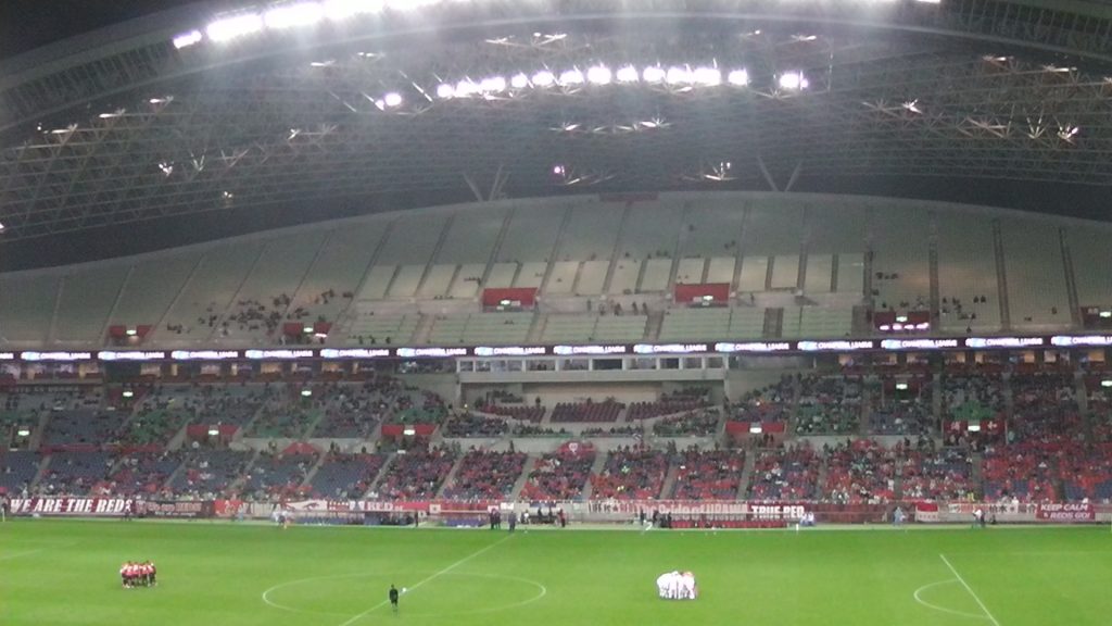 陸上競技場とは違い、席によっては肉眼で選手の顔さえちゃんと見られるくらいサッカースタジアム。これがより試合の迫力を高めてくれます。